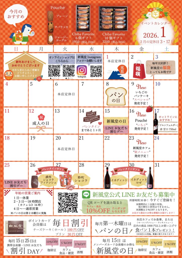 新風堂本店 新風堂アリオ店 ふろまーじゅ 会社概要 採用情報 お問い合わせ オンラインストア 公式 楽天 HOME 新風堂本店 新風堂アリオ店 ふろまーじゅ 会社概要 採用情報 お問い合わせ オンラインストア 公式 楽天 News新着情報 2026年1月イベントカレンダー 更新日:2025/12/29 新着情報一覧に戻る